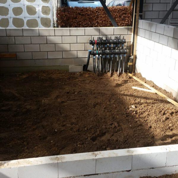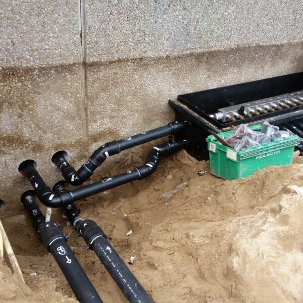 Als de boring is aangebracht, starten voor ons de werkzaamheden en kunnen wij het horizontale leidingwerk aanleggen. Met onze midikraan graven wij het traject van de boring naar het gebouw.