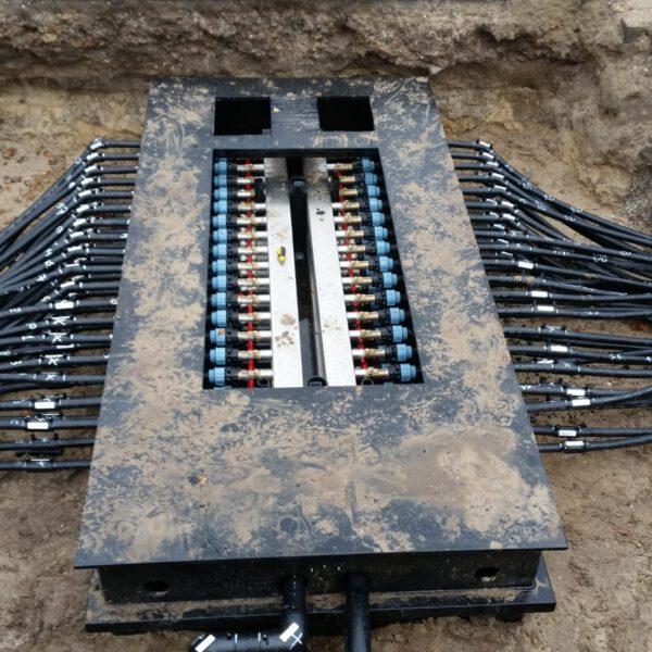 • Verdeler in een put, hier wordt op de vooraf bepaalde locatie een verzamelput met daarin een verdeler ingegraven waar de boringen naartoe gebracht worden. Vanaf de put worden er twee leidingen naar binnen gemaakt (aanvoer/retour).